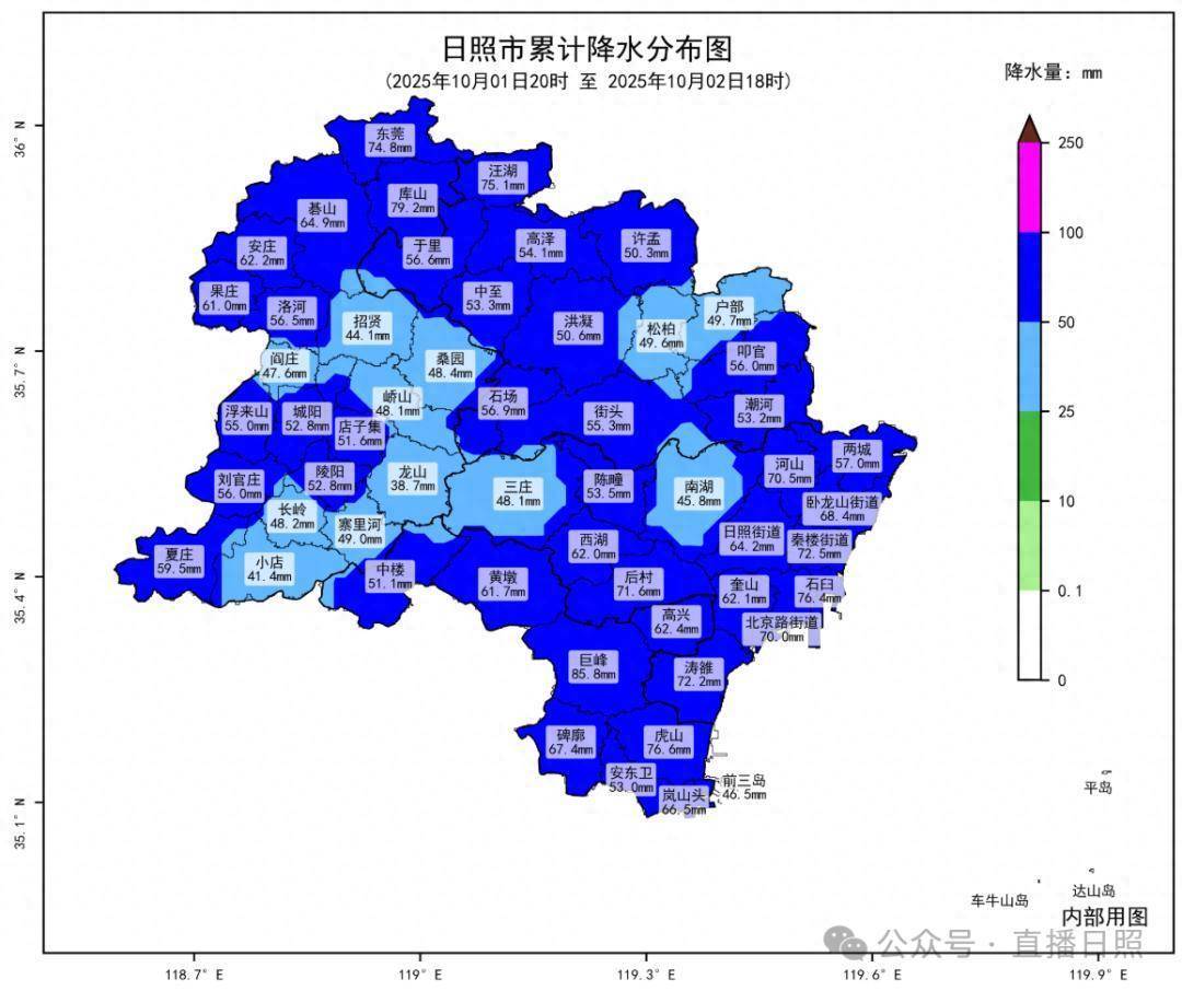 各区县平均降水量如下:东港区60.0毫米,岚山区66.7毫米,莒县55.2毫米,五莲县54.2毫米,经济技术开发区66.0毫米,山海天旅游度假区61.5毫米,高新技术产业开发区66.7毫米。
