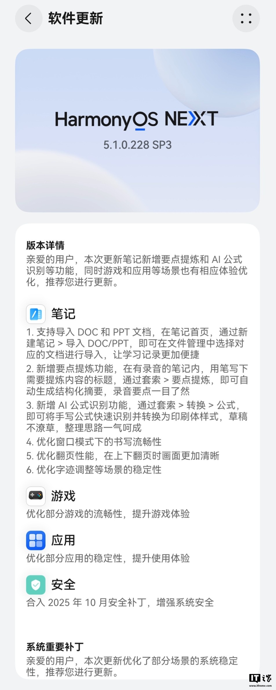 笔记:支持导入.DOC(Word)和.PPT(PowerPoint)文档,可在笔记首页通过新建笔记--> 导入 DOC / PPT,即可在文件管理中选择对应的文档进行导入,让学习记录更加便捷新增要点提炼功能,在有录音的笔记内,用笔写下需要提炼内容的标题,通过套索--> 要点提炼,即可自动生成结构化摘要,录音要点一目了然新增 AI 公式识别功能,通过套索--> 转换--> 公式,即可将手写公式快速识别并转换为印刷体样式,草稿不潦草,整理思路一气呵成优化窗口模式下的书写流畅性优化翻页性能,在上下翻页时画面更加清晰优化字迹调整等场景的稳定性游戏:优化部分游戏的流畅性,提升游戏体验应用:优化部分应用的稳定性,提升使用体验安全:合入 2025 年 10 月安全补丁,增强系统安全同时根据IT之家小伙伴的反馈,本次更新解决了屏幕刷新率锁定在 90 帧的小问题,提升了使用体验。