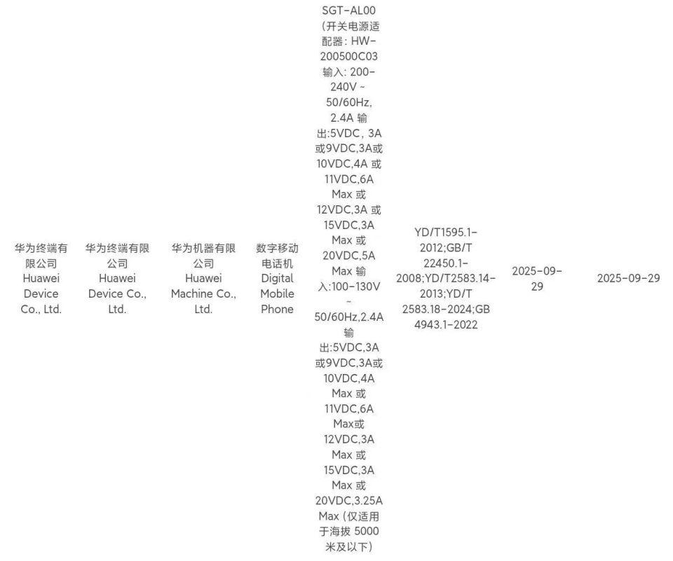 按照华为的惯例,大概率对应的是 Mate 80、Mate 80 Pro 和 Mate 80 Pro+,这点从曝光的充电功率就很好猜测。型号为 VYG-AL00 的机型支持 66W 有线充电,型号为 SGT-AL00 和 SGT-AL50 的新机支持 100W 有线快充。当然,也有可能是 Nova15,但果子觉得还是 Mate 80 可能性大。